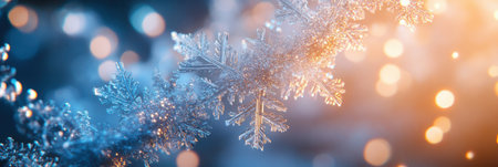 Intricate snowflake shapes shimmer in glowing icy hues, capturing the essence of winter's delicate beauty and frost's enchanting charm.