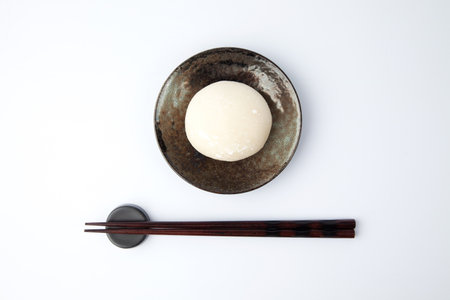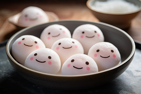 White Mochi Ice Cream with a kawaii cute face. Mochi Japanese dessert on a plate