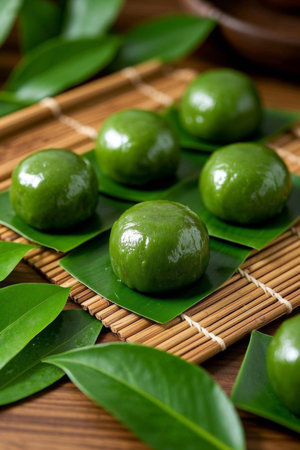A beautiful assortment of traditional Asian desserts arranged on a decorative plate, adorned with vibrant edible flowers and green leaves, showcasing culinary artistry.