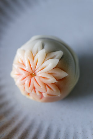 Pastel Japanese mochi with flower decorations, placed on an elegant plat