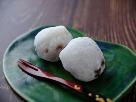 Japanese sweets Kintsuba on a plate. Kintsuba is sweetened red beans wrapped in wheat flour dough.