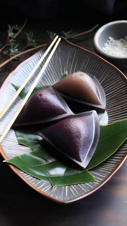 Delight in the beauty of traditional Japanese sweets served elegantly on a rustic wooden plate, accompanied by a calming tea cup, perfect for a serene snack experience.