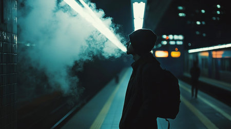 A person stands on a train platform, illuminated by bright lights and surrounded by vapor. The scene has a moody, cinematic feel.