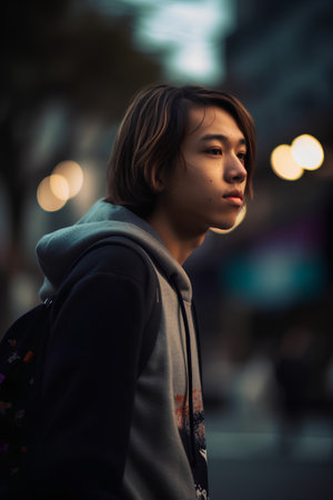 Close-up of a young asian man in casual clothing, looking pensive against a blurred urban background
