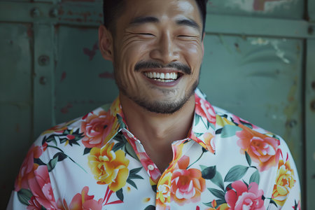 Digital artwork of asian man wears a floral shirt and smiles, high quality, high resolution