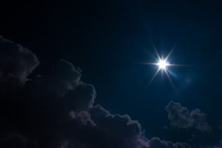 The bright star shines with its yellow light and blinds the eyes. Clouds formed around a bright star. Planet Earth or cosmic landscapes.