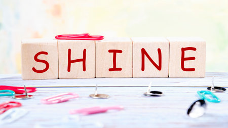 SHINE word written on wooden blocks , and bright paper clips and buttons create an organized workspace