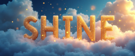 The word SHINE glimmers in golden sparkles, rising majestically above soft, billowing clouds. This uplifting image radiates positivity and inspiration, inviting viewers to embrace their inner light and potential.