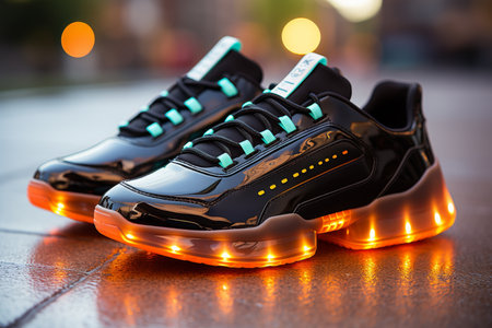 A striking image showcasing a modern sneaker illuminated by LED lights. Surrounded by an array of gadgets and technical components, this flat lay evokes innovation and style.