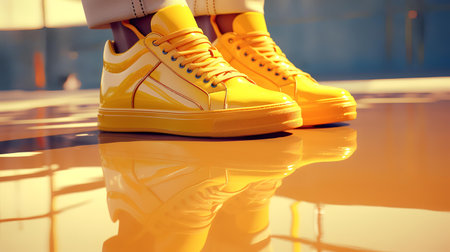 A person wearing yellow shoes and pants standing on a white floor, AI