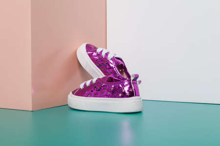 Unisex sports shoes, sneakers isolated over purple neon background. Urban city fashion, fitness, sport, training concept.
