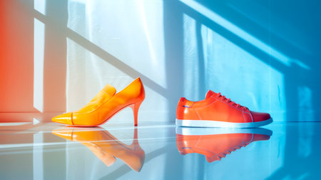 A striking pair of high heels in a bold orange hue stands elegantly beside matching casual sneakers in a stylish, brightly lit environment. The contrast captures attention.