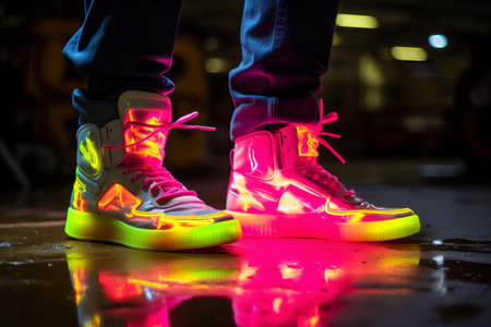 An AI generated illustration of a closeup of glowing sneakers on the dark street