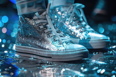 Sparkling Silver Sneakers on Reflective Surface with Bokeh Lighting in Background