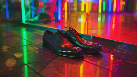 a close shot of tap shoes tapping on a brightly lit dance floor, created with generative ai