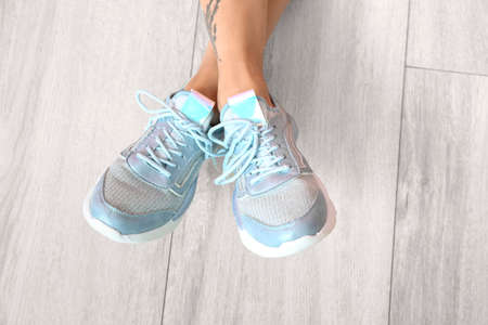 Closeup female sports shoes, sneakers isolated over neoned background. Urban city fashion, fitness, sport, training concept.