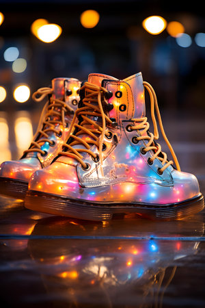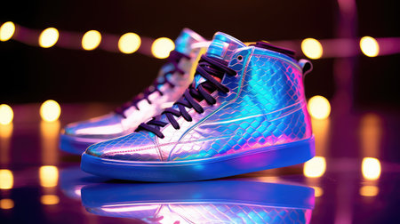 Stylish Silver High-Top Sneakers Reflecting Stage Lights in a Vibrant Setting