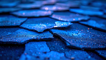 Extreme close-up of dark blue, wet asphalt roof shingles covered in tiny water droplets, creating a textured pattern.