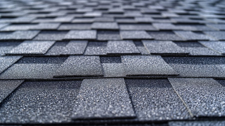 Rainwater droplets form on black asphalt shingles, creating a sleek and modern geometric pattern. The wet weather adds texture and depth to the roof, highlighting safety and protection
