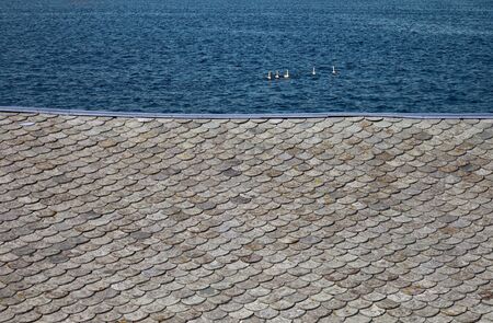 Red clay tiles roof pattern on sea background