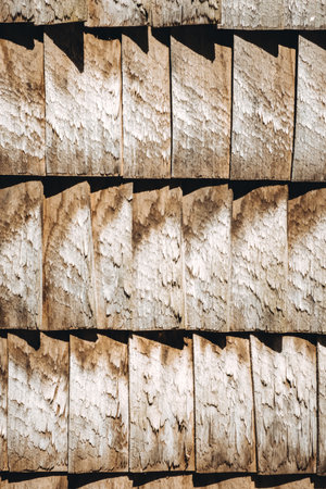 Traditional alpine wooden shingle wall in the sun