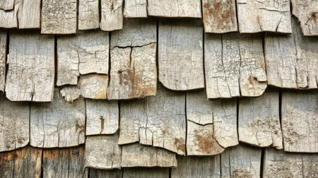 Close-up of weathered wooden shingles showcasing a rustic texture. The aged wood features cracks and imperfections, adding character to architecture.