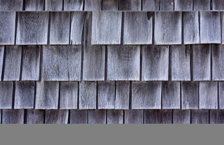A closeup view of overlapping wooden shingles creates a textured background. The rich brown tones and natural grain evoke a sense of rustic charm.