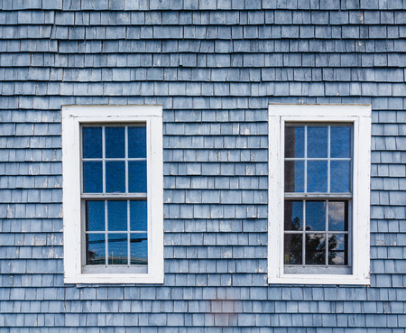 Cedar shingles which have shrunk and faded gray with age in the early morning light.
