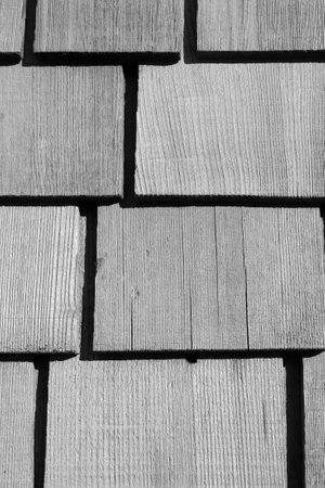 A close up shot of a detailed wooden shingle roof, showing the texture and patterns of the weathered wood.