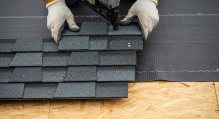 A close-up view captures a roofer's hands, clad in white protective gloves, meticulously installing dark grey asphalt shingles. A pneumatic nail gun is actively fastening the shingles to the wooden roof deck. The textured surface of the shingles and the underlying OSB or plywood are clearly visible. A layer of underlayment or protective membrane is also present. focuses on the detailed process of roofing construction and repair, highlighting the tools and involved.