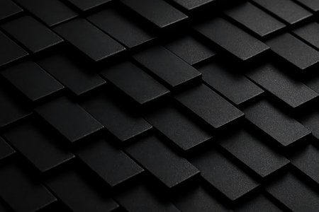 A close-up view of an abstract pattern featuring overlapping dark gray and black rectangular shapes. The surface exhibits a wet, textured appearance with small, reflective speckles. This geometric arrangement resembles scales, shingles, or tiles, creating a modern and sophisticated visual element. Ideal for contemporary design projects, digital backdrops, or conceptual artwork.