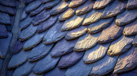 Sunlight illuminating a slate roof, creating a textured pattern. Overlapping tiles add depth and dimension, giving a unique look. Natural slate adds rustic charm and weathered character