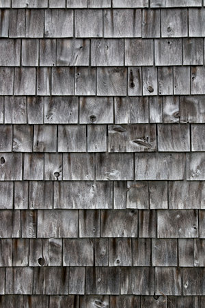 Wide view of cedar shingles which have shrunk and faded gray with age in the early morning light.