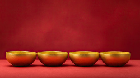 This image features four elegant golden bowls positioned on a bright red background, perfect for themes of culture, celebration, and artistic displays.