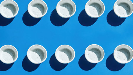 This image features a striking arrangement of round white ceramic bowls on a bright blue background, emphasizing minimalist design and artistic composition.