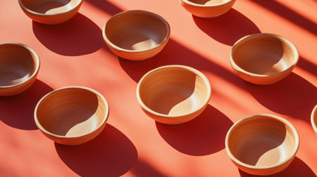 A captivating display of clay bowls arranged on a striking red surface. The interplay of soft shadows and natural light creates an aesthetically pleasing composition.