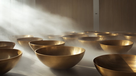 A tranquil interior scene featuring golden bowls surrounded by a gentle mist, creating a harmonious atmosphere perfect for relaxation and meditation.