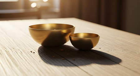 Two smooth golden brass bowls rest on a textured wooden table, illuminated by warm natural sunlight that casts long shadows. The image evokes a sense of minimalism, peace, and spiritual grounding suitable for meditation themes.