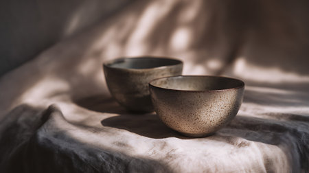 Two ceramic bowls on a table in the sunlight. Selective focus.