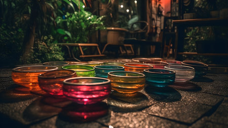 Colorful Glass Bowls Arranged Outdoors for Crystal Meditation or Yoga in Tranquil Garden Setting with Lush Greenery and Ambient Lighting