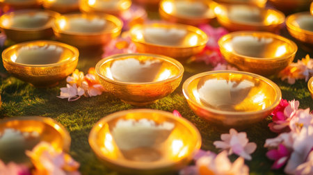 A serene arrangement of golden bowls elegantly set among colorful flower petals on lush green grass, creating a tranquil and inviting atmosphere in natural light.