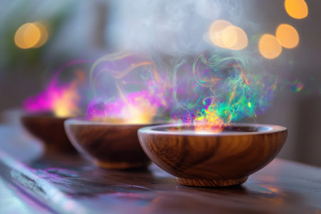 Aromatic smoke in vibrant colors swirls from wooden bowls placed on a wooden table in a warm, inviting space.