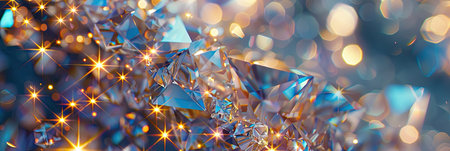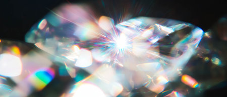 A close-up view of shiny, sparkling crystals exhibits an intricate texture. The crystals glimmer and reflect light, creating a stunning array of colors and reflections. Their surface captures and disperses light, giving a sense of depth and brilliance in an enchanting atmosphere filled with shimmering details.