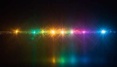 Cool lens flares and optical effects create a vibrant display of light against a dark backdrop
