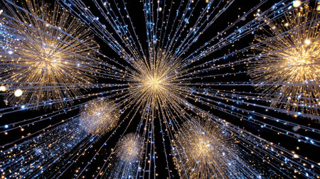 Stunning visual of dynamic light bursts resembling stars in a dark sky. This captivating image creates a magical atmosphere ideal for various creative projects.