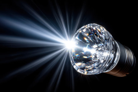 Image of white light with beam and prismatic lens flare on dark background. electricity, light technology, communication and science research concept digitally generated image.