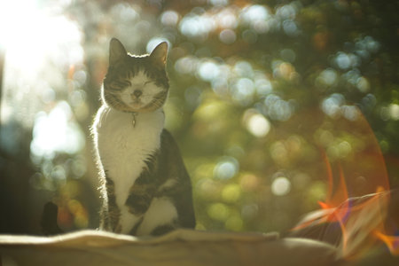 Loovely ginger cat relaxed in the sunny garden with sun rays. Relaxing pet portrait.