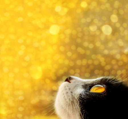 Tuxedo cat looking up, blurry bokeh background, square view. Animals, holidays, pets conÑept.