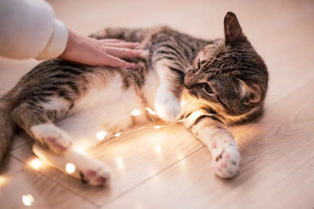 Close up. A child's palm strokes a tabby kitten playing with a festive garland. Scandinavian interior. Copy space.