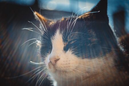 close up face tabby cat in evening light with blur background.